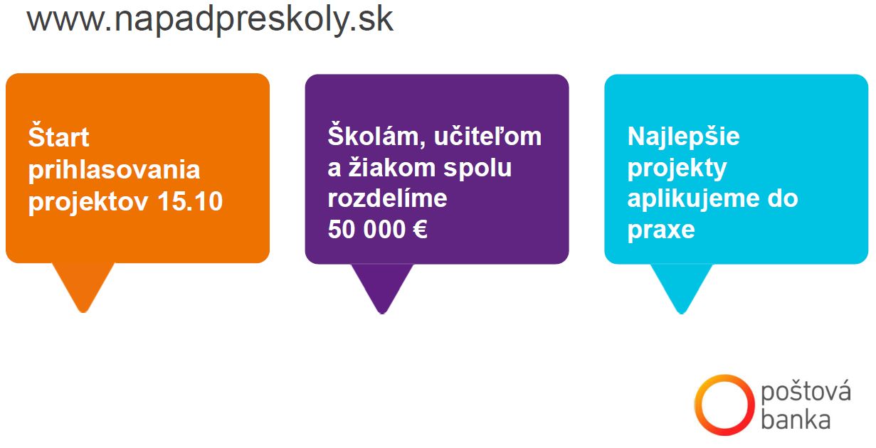 V podpore vzdelávania mladých Poštová banka plánuje pokračovať dlhodobo. Od polovice októbra spolu s Nadáciou Poštovej banky vyhlasuje nový grantový program „Nápad pre školy“ na podporu vzdelávania v oblasti finančnej gramotnosti na stredných a základných školách. „Finančná gramotnosť na Slovensku je na dlhodobo nízkej úrovni, čo potvrdil aj náš nedávny prieskum*. Žiaľ, lepšie na tom nie sú ani mladí ľudia, ktorí navyše často preberajú negatívne vzory finančného správania svojich rodičov. Preto sme sa rozhodli v tejto oblasti pomôcť a podporiť nápady a projekty na podporu vzdelávania mladých v tejto pre život veľmi dôležitej oblasti,“ vysvetľuje Lýdia Žáčková. Prostredníctvom grantu Poštová banka podporí 8 škôl, 6 učiteľov a 6 tried, ktorým celkovo rozdá sumu 50 000 eur. Informácie o programe môžu školy aj žiaci nájsť na novej web stránke www.napadpreskoly.sk.