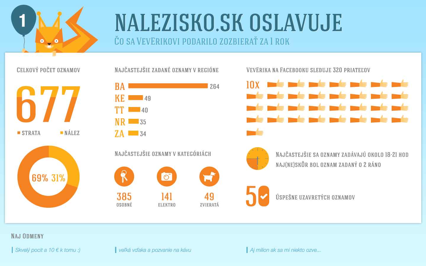 Za prvý rok od spustenia neziskového projektu Nalezisko.sk sa podarilo zverejniť vyše 470 oznamov o stratách a nálezcovia ohlásili vyše 200 správ o nálezoch rôznych osobných vecí. Ľudia najčastejšie strácajú kľúče, peňaženku, doklady alebo mobil.