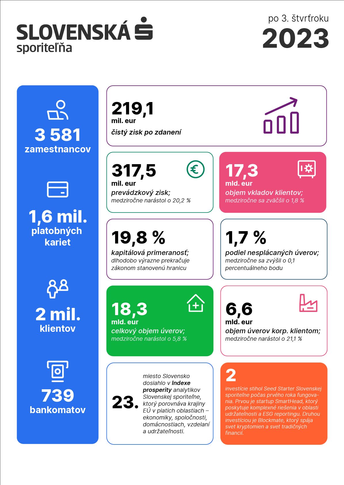 „Pozitívny vplyv na naše výsledky má samozrejme sprísnenie menovej politiky ECB. Ide však o veľké zjednodušenie príbehu. Veľký vplyv má totiž aj rast nášho biznisu, najmä firemného s viac ako pätinovým medziročným rastom. Úrokový výnos nám rastie z veľkej časti práve vďaka firemnému financovaniu. Nižšie rizikové náklady zase hovoria o lepšom stave ekonomiky a financií domácností. Dobrou správou tretieho štvrťroka sú dve investície Seed Startera, nášho venture kapitálového fondu. SmartHead poskytuje komplexné riešenia v oblasti udržateľnosti a ESG reportingu a Blockmate spája svet kryptomien so svetom tradičných financií. Verím, že obe pozitívne ovplyvnia nielen kvalitu našich služieb, ale aj hospodárenie,“ vraví Pavel Cetkovský, finančný riaditeľ a člen Predstavenstva Slovenskej sporiteľne.