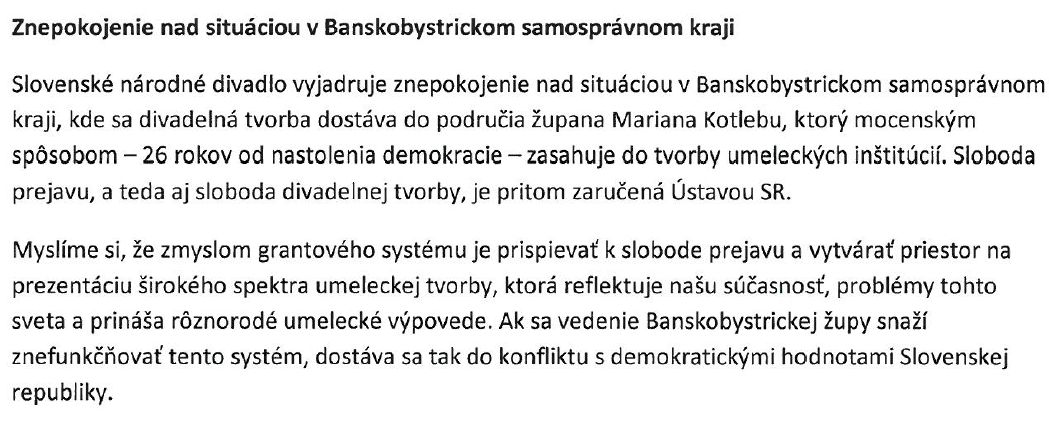 Pod text súvisiaceho stanoviska Znepokojenie nad situáciou v Banskobystrickom samosprávnom kraji sa k dnešnému dňu podpísali desiatky umelcov a zamestnancov SND. Medzi signatármi sú: