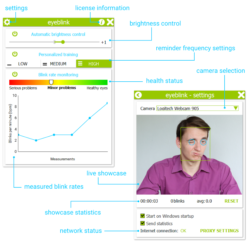 Jedinečnou pomôckou, ktorá naše oči a žmurkanie „postráži" za nás, je práve Eyeblink. Aplikácia priebežne kontroluje, či žmurkáme toľko, ako by zdravý človek mal. Ak nie, upozorňuje nás na to, aby sme žmurkli.