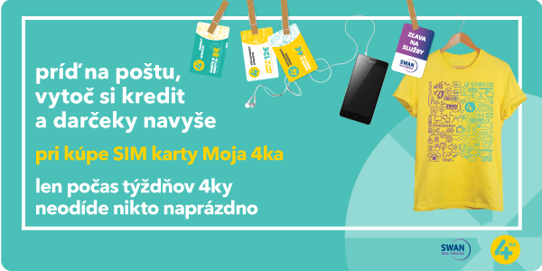 Každý nový zákazník počas Týždňov 4ky vyhráva, a to hneď dvakrát. Tak, ako všetci zákazníci štvrtého mobilného operátora, získava výhodné ceny volaní, SMS či dát a navyše na vybraných pobočkách Slovenskej pošty môže po kúpe novej SIM karty roztočiť aj kolesom šťastia. Domov určite odíde s jednou z výhier – minimálne s bonusovým štvoreurovým kreditom!