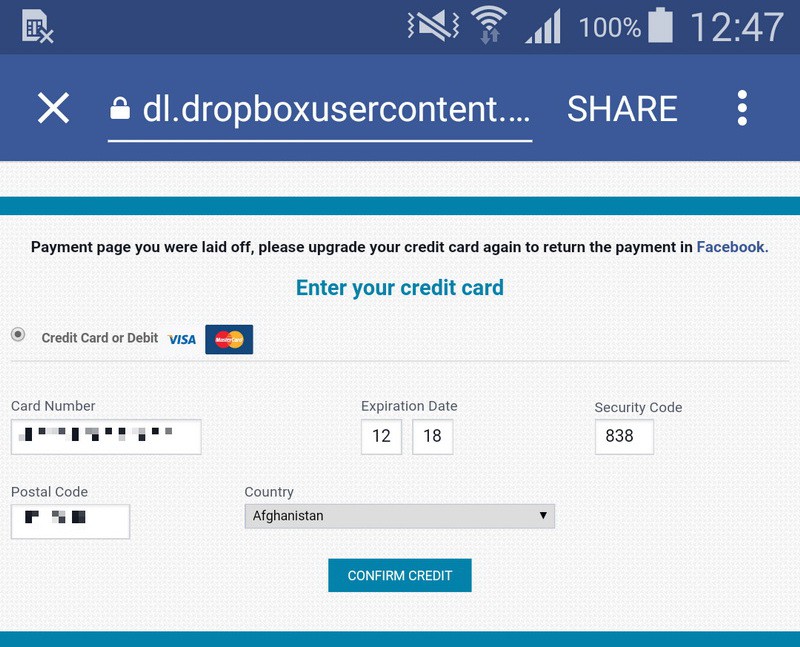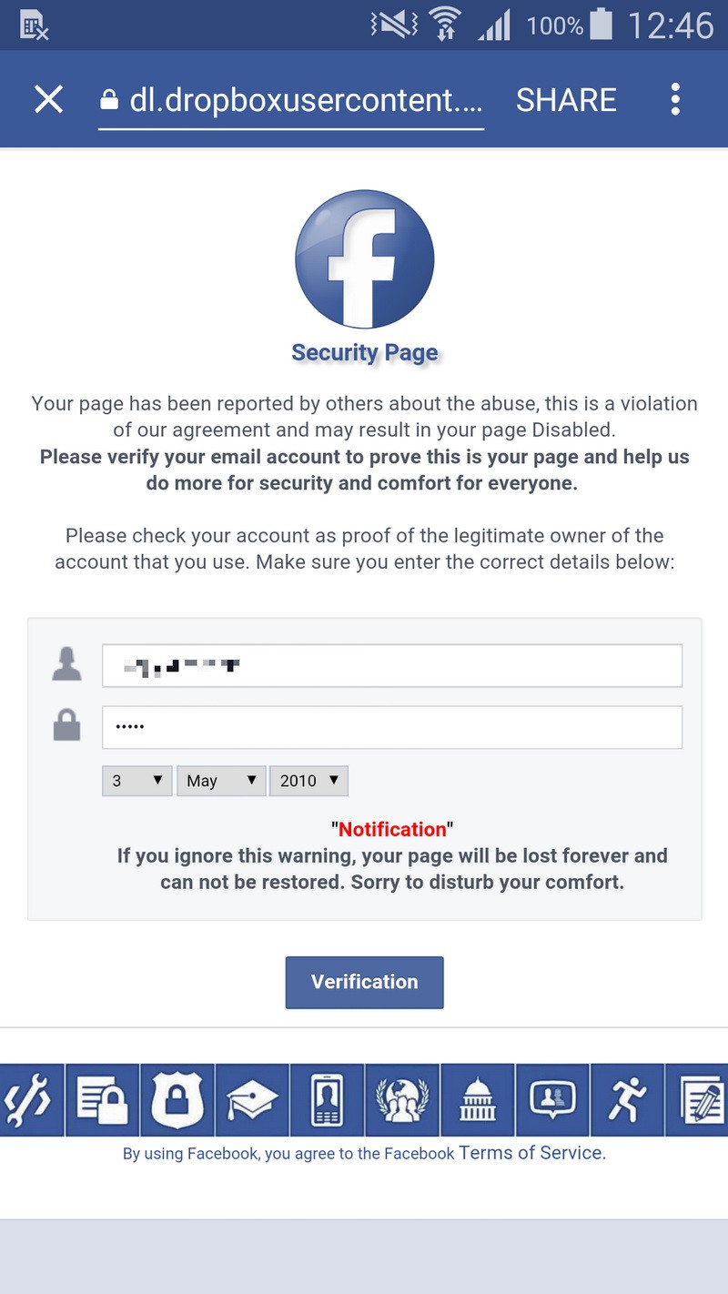 Administrátorov týchto stránok varuje, že ich účet bol z istého dôvodu ostatnými používateľmi Facebooku označený ako podozrivý a musia ho obnoviť. Falošné varovanie obsahuje zároveň link na formulár, vďaka ktorému útočník zbiera prihlasovacie údaje a čísla platobných kariet svojich obetí.
