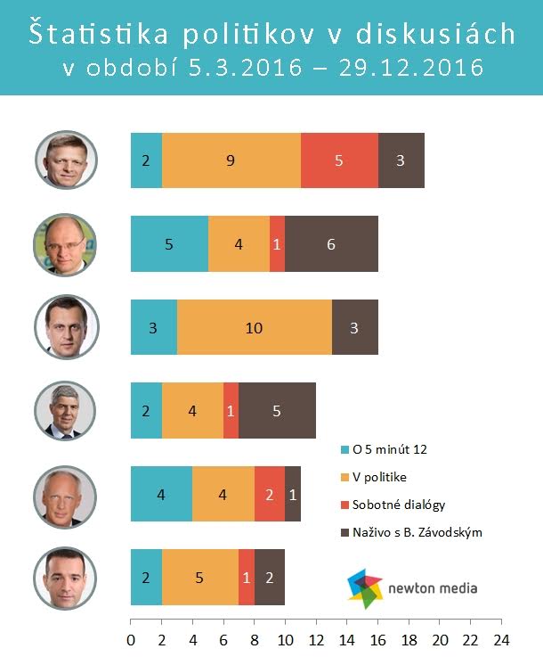 V roku 2016, počas tretej vlády Roberta Fica, politické diskusie najviac navštevoval Robert Fico. V reláciách O 5 minút 12, V politike, Sobotné dialógy, Na telo, Naživo s Braňom Závodským zaznamenal 19 účastí. Druhé miesto spoločne obsadili Richard Sulík (SaS) a Andrej Danko (SNS). Obidvaja diskusie navštívili 16-krát.