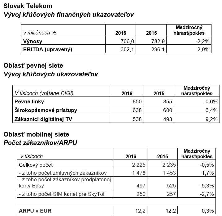 Skupine sa darí pri ukazovateľovi prevádzkového zisku EBITDA, ktorý stúpol medziročne o 2% na 302,1 milióna eur a EBITDA marža sa vylepšila na 39,4% za celý rok 2016. Popri vyššom EBITDA investuje Slovak Telekom aj do budovania moderných sietí a dotovaní koncových zariadení.