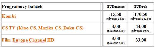 Od 1. októbra sa zvyšuje cena aj za prémiový balík CS TV, v ktorom je Kino CS, Muzika CS, Doku CS z 3,70 na 4 eura za mesiac. Pri platbe za rok z 40,70 na 44. A pri prémiovom balíku so stanicou Film Europe Channel HD z 2 eur na 3 eura.