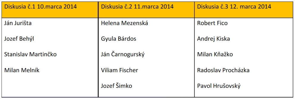 Predvolebné diskusie vysiela posledný týždeň pred voľbami aj RTVS, prvú odvysielala dnes o 20:15. Prvú odvysielala dnes, ďalšie pôjdu v utorok a stredu večer. „Kandidáti sú zoradení do týchto diskusií podľa priemeru výsledkov štyroch prieskumov volebných preferencií, ktoré si objednal RTVS. Je to štandardný postup aj v iných európskych krajinách, ako príklad by som uviedol vysielanie Českej televízie pred poslednými prezidentskými voľbami v ČR," povedal Václav Mika generálny riaditeľ RTVS.