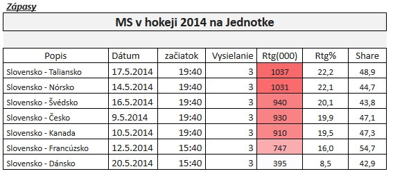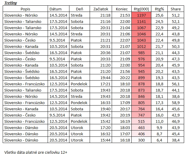 Zápasy slovenskej reprezentácie prekročili milión divákov. Najviac divákov sledovalo poslednú tretinu zápasu Slovensko – Nórsko.